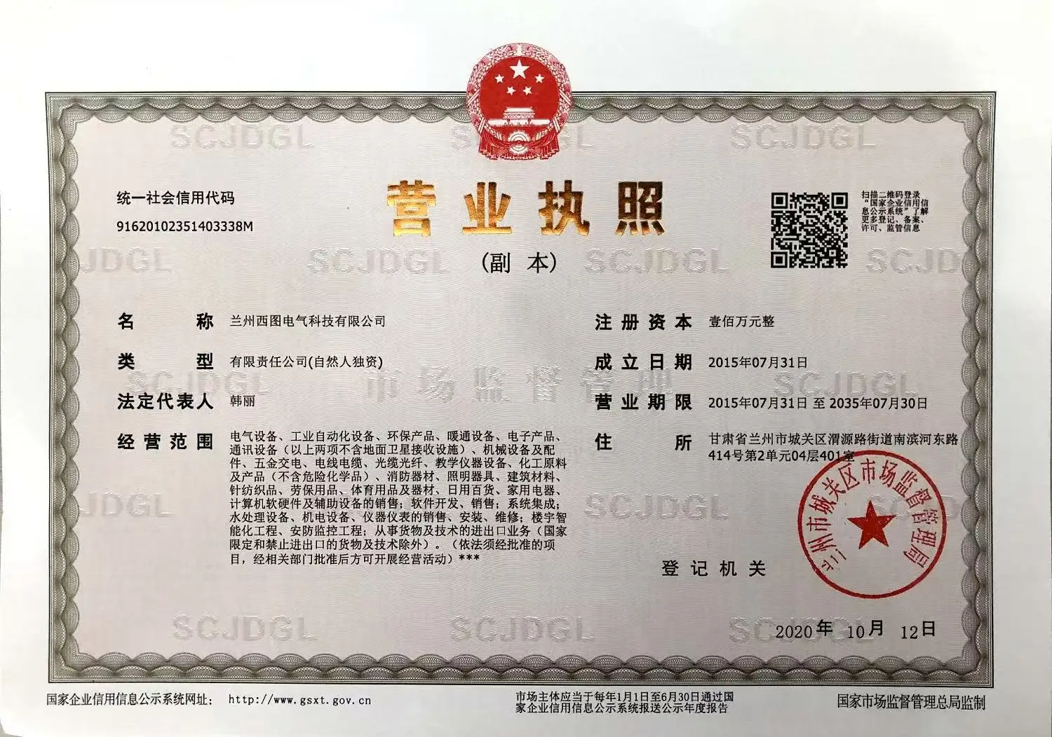 Registered address : Room 401, Floor 04, Unit 2, No. 414, Nanbinhe East Road, Weiyuan Road Street, Chengguan District, Lanzhou City, Gansu Province Lanzhou Gansu China